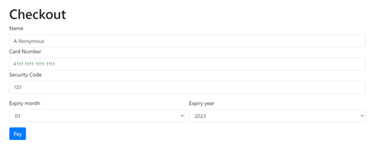 - Use a test card number and associated information provided in our Testing Guides (testing-guide.html) to process a test transaction. Enter the information in the Checkout page and clickPayto process the transaction.