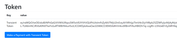 For this test, the token is returned and displays on the response page. You can proceed toStep 5: Test Integration Using a Tokenized Payment Cardto use the token to perform a transaction, or choose theMake a Payment with Transient Tokenbutton to process a transaction.In a live system, you will capture this token in the browser, return it to your back-office system, and continue the payment process using our REST API.