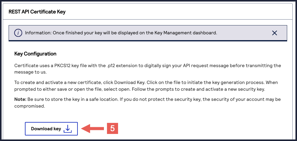 The.p12file downloads to your desktop.If prompted by your system, approve the location to which the key downloads.