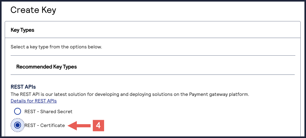 - Under REST APIs, chooseREST – Certificate, and then clickGenerate key.If you are using aportfolioaccount, the Key options window appears, giving you the choice to create a meta key.