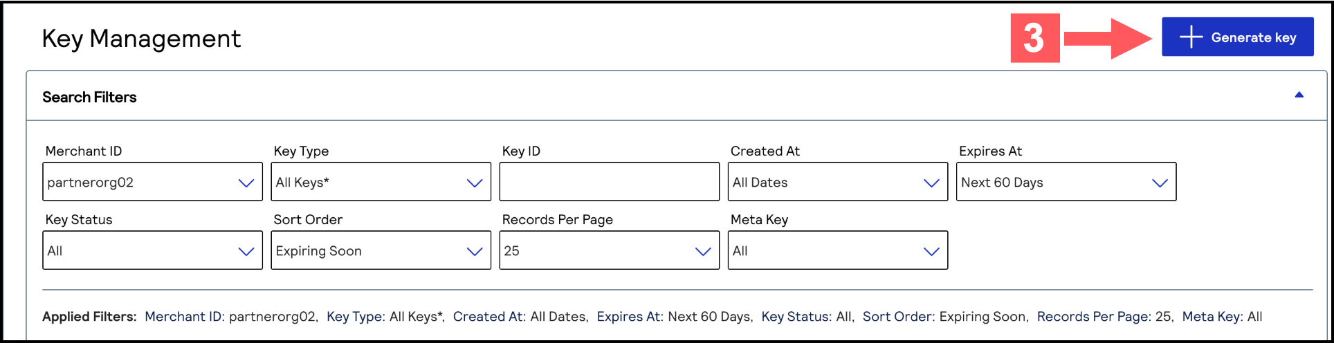- Check one or more transacting MID account boxes, and clickSubmit.The Key Generation page opens.