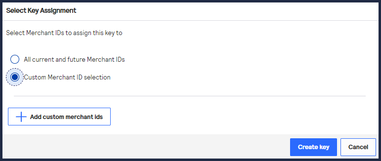 - To assign this key to a specific merchant or group of merchants, chooseCustom Merchant ID selectionand then clickCreate key. This key is not automatically assigned to any future merchants. Proceed to the following steps.
