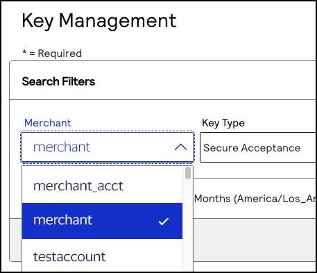 - In theMerchant IDsearch filter, choose your merchant account ID.If you logged in from a portfolio user account or the account (_acct) level, verify that the merchant ID you choose does not contain_acctin the ID name.