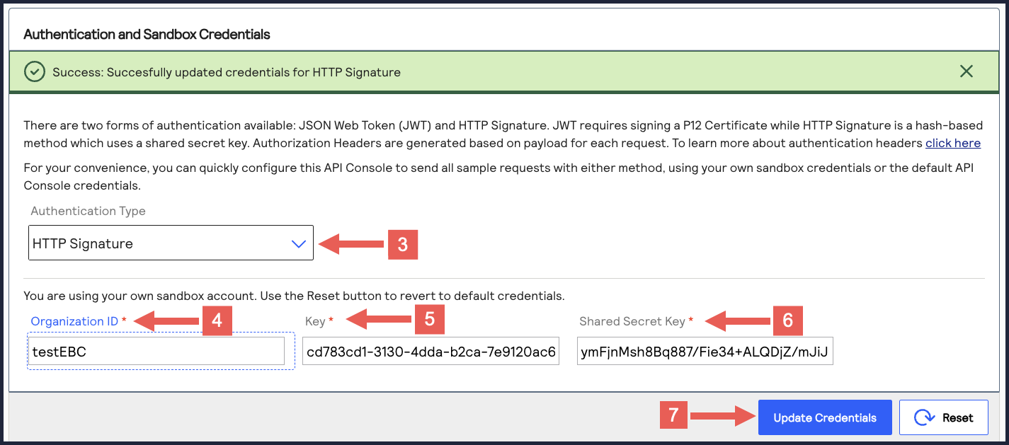 - Under Authentication and Sandbox Credentials, go to the Authentication Type drop-down menu and chooseHTTP Signature.