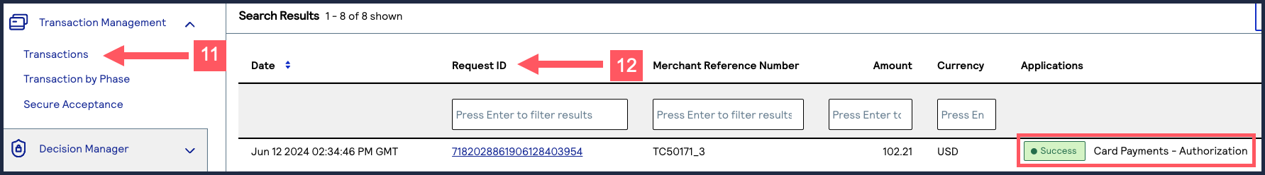 - Under Search Results, verify that the request ID from the test authorization response is listed in the Request ID column.If the test authorization was successful, a success message is present in the corresponding Applications column.