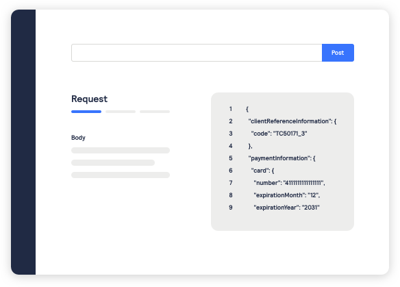 View sample code and API field descriptions. Send requests to the sandbox and see the responses.